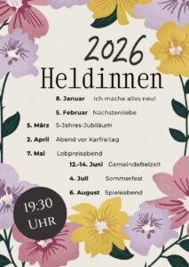 Events HEILIG ABEND GOTTESDIENST Ab 15 Uhr Kaffee und Gebäck 16 Uhr Gottesdienst EIN ABEND VON UND FÜR FRAUEN Bei Fragen:  heldinnen@czgz.de Veranstaltungskalender  nach oben, zum Seitenanfang